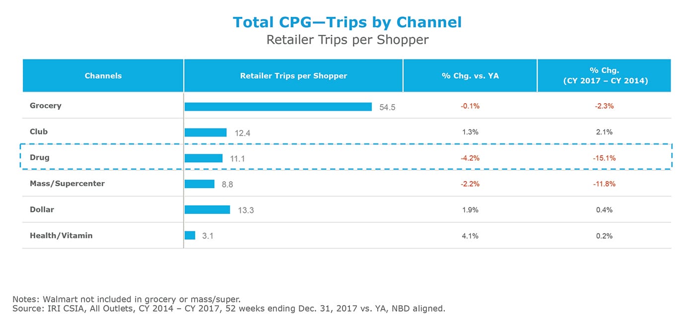 Drug stores have sustained a dip in trips in recent years, down nearly 15% from 2015 to 2017, according to IRI. This loss of trips is challenging for the drug class of trade, as stores lose the foot traffic they need to accelerate growth.
