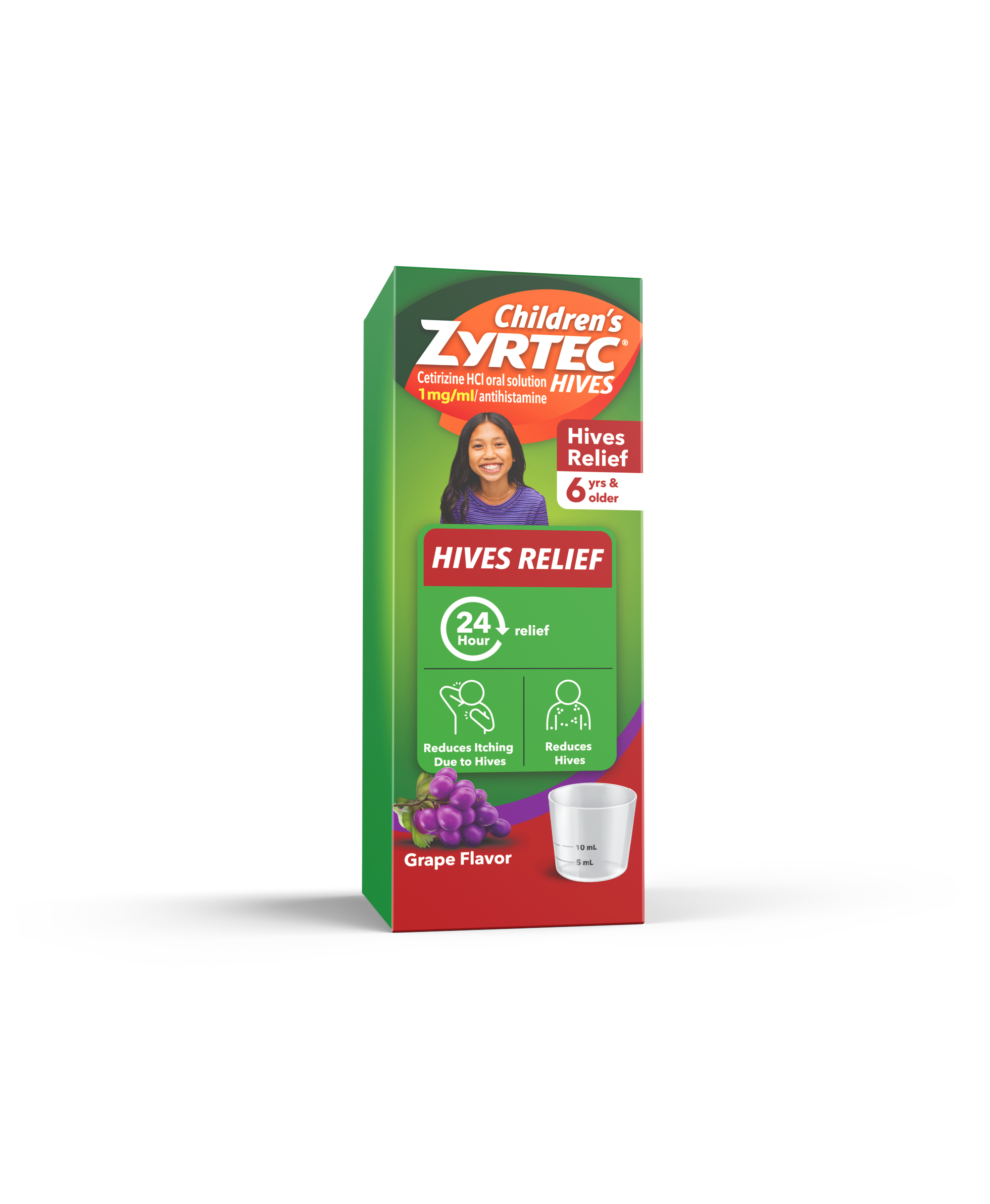 - For the little ones, Children’s ZYRTEC Hive Relief is a steroid-free solution that provides kids with long-lasting relief from hive-related itching and helps to reduce hives. Available in a tasty grape flavor (the ONLY pediatric hives relief product in an appealing liquid form!), Children’s ZYRTEC Hives Relief provides 24-hour relief for ages 6 and up.